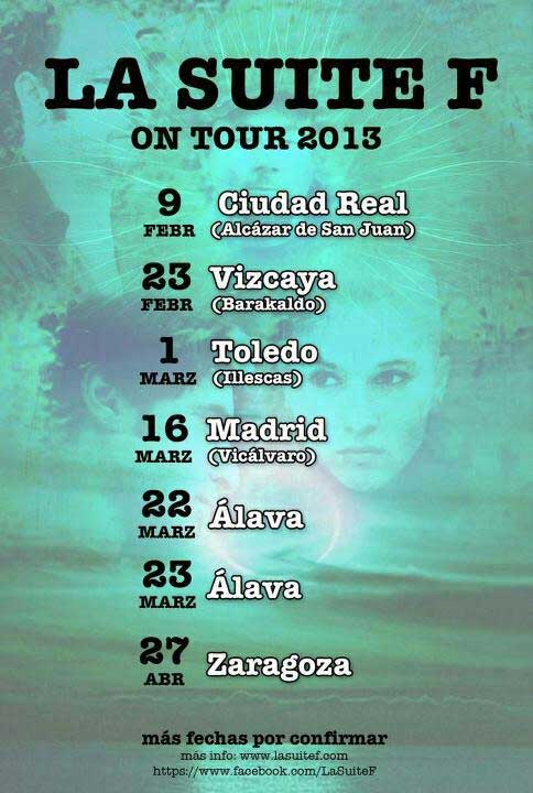 Desde que hace ya unos meses se publicara "DIAMANTES BRUTOS", su primer disco, los madrileños LA SUITE F no han parado de dar conciertos y de descargar su propuesta de rock duro mezclado con hip-hop, funk y drum & bass, lo que los hace originales y muy interesantes. Las críticas no han podido ser mejores, tanto su directo donde destaca la arrolladora personalidad de su vocalista Carla como para el disco que incluye los que ya se pueden considerar sus primeros éxitos, así no es extraño que durante los conciertos, el público coree junto a la banda las letras de "Ovejas Negras", "Inmolación" o "Tira los dados". Algo que seguramente se repetirá en sus próximos conciertos, que serán... sábado 9 de febrero en sala Estación Groove (antigua Arco) Alcazar de San Juan en Ciudad Real(Av.de las Bodegas, 30) sábado 23 de febrero en sala Edaska Barakaldo en Bizkaia (c/.San Juan, 12) (junto a Kauce) viernes 1 de marzo en Bourbon café Illescas en Toledo (Ctra.Ugena, 13) sábado 16 de marzo en sala Joey Vicalvaro en Madrid (c/.Socorro, 20 22 y 23 de marzo estarán por Alaba (salas pendientes de confirmación) sábado 27 de abril en la Creedence de Zaragoza (Pl.San Lamberto, 3)
