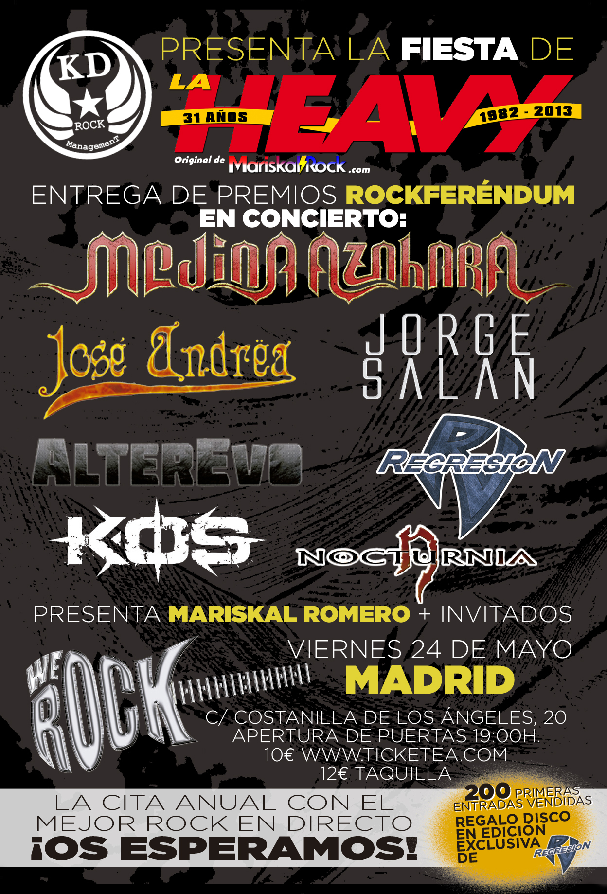 (Manuel Ibáñez). Otros dos artistas agraciados tocarán en la fiesta: Jorge Salán (mejor guitarrista, un clásico de la categoría a pesar de que aún es joven) y AlterEvo (grupo revelación). Durante muchos años recogió trofeos José Andrea con Mägo de Oz, y tampoco ha querido perdérselo en esta nueva etapa de su carrera artística. Completan el cartel los toledanos Nocturnia, cuya popularidad ha crecido por haber sido la banda de Rafa Carpena y que presentarán nuevo cantante, los salmantinos K-ØS y los catalanes Regresión.