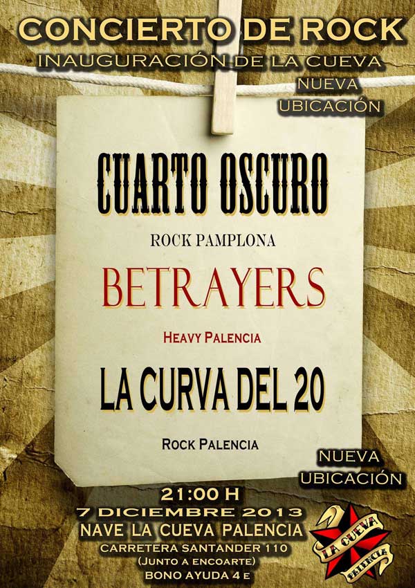 inauguración "La Cueva" de Paléncia(nueva ubicación de La Cueva en Ctra. Santander, 110 - al lado de Encoarte - Paléncia) sábado 7 diciembre, desde las 21:00 h. (bono ayuda 4€) | ||||