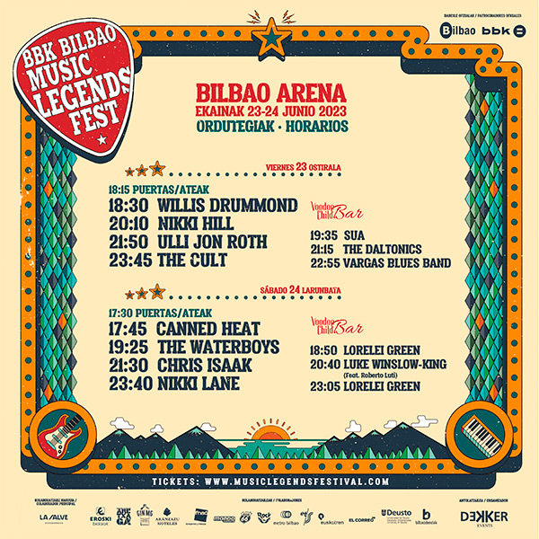 A estos grandes artistas se les sumarán la inspiradora banda escocesa de rock-folk THE WATERBOYS y la banda de blues-rock/boogie CANNED HEAT, además de la electrizante nueva reina del soul-rock NIKKI HILL, el legendario ULI JON ROTH (Ex-Scorpions), la cantante y compositora de música country-rock NIKKI LANE, la banda de rock euskaldun WILLIS DRUMMOND, la veterana formación VARGAS BLUES BAND y el productor y compositor estadounidense LUKE WINSLOW-KING (feat. Roberto Luti). Además en el Voodoo Child Bar habrá actuaciones de las siguientes bandas locales: Lorelei Green, Sua, y The Daltonics. |