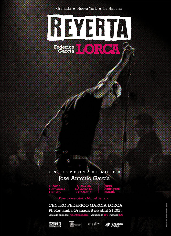 | | | | | | El poderoso y emocionante cartel promocional corre a cargo del diseñador granadino Jesús Gilabert. La Fundación Unicaja ha confiado y apoyado que este proyecto se lleva a cabo. El espectáculo se estrenará en el Festival Internacional de Poesía de Granada REYERTA - Granada, Nueva York, La Habana, el nuevo espectáculo de José Antonio García. Más información en www.fipgranada.com |